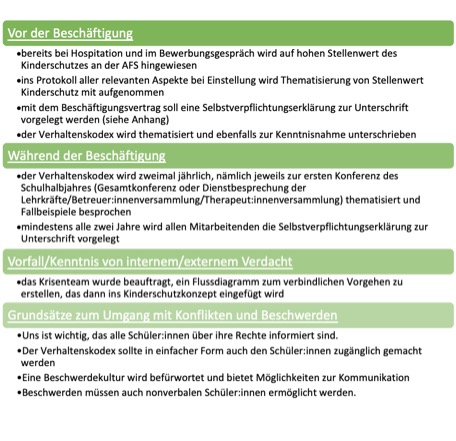 - der Verhaltenskodex wird einmal jährlich in der 1. Konferenz zum 2. Schulhalbjahr (Stufenkonferenzen/Erzieherversammlung/Betreuerversammlung/Therapeutenver-sammlung) thematisiert und Fallbeispiele besprochen