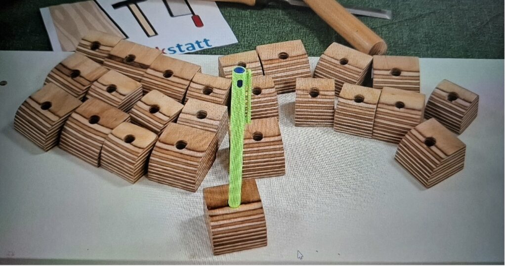 Unsere Produkte sind zum Beispiel Stiftehalter, Buntstiftehalter, Postkartenhalter, Magnet-Angelspiele oder Holzbuchstaben.